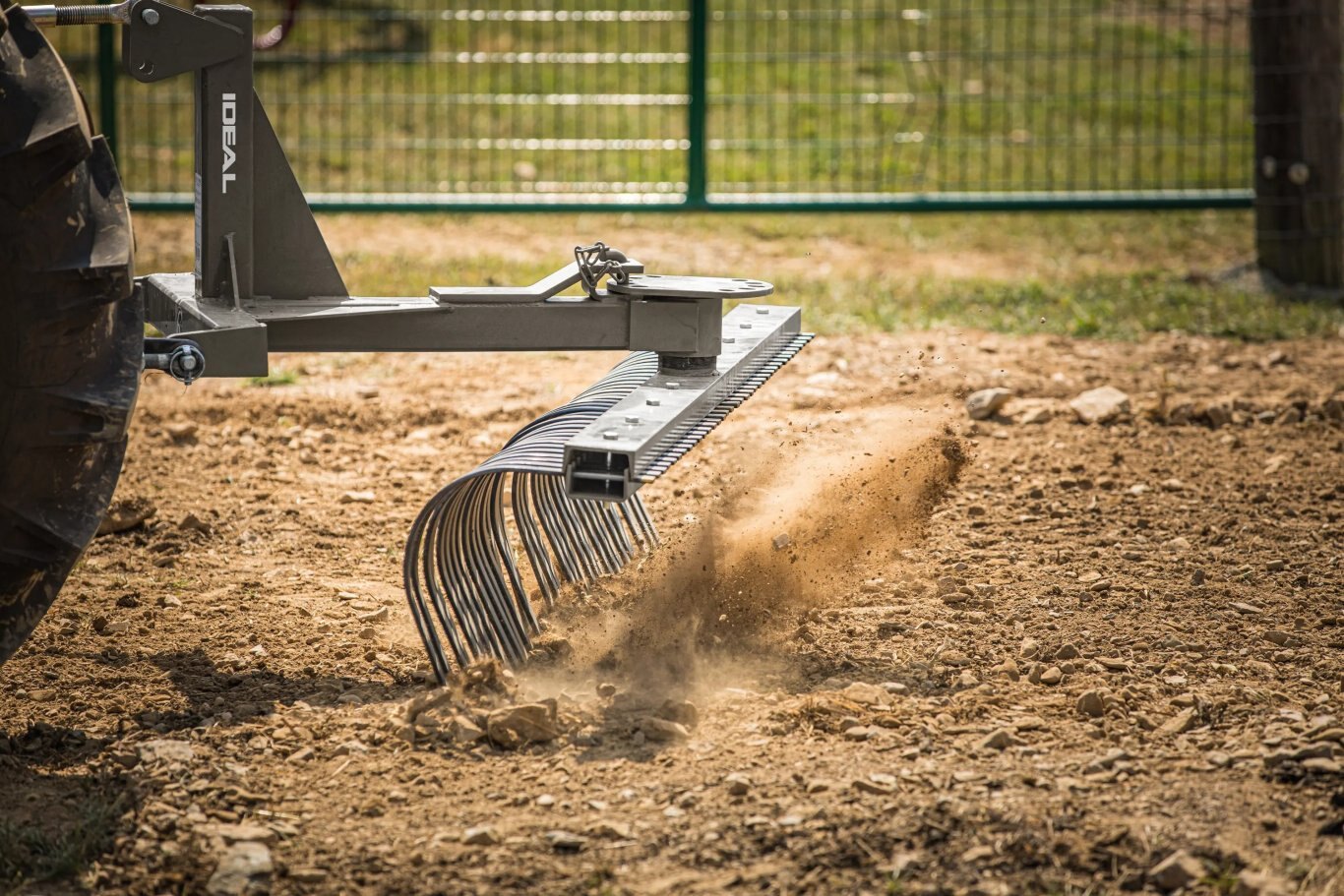 A versatile and easy to use rake, the Ideal Farm Equipment Landscape Rake makes raking, smoothing and contouring gravel or soil easy. The curved C-Tines are shallow enough to protect your field, but can be angled to move items such as rocks easily. Order an optional wheel kit (LRWKID) to set your depth and improve maneuverability.