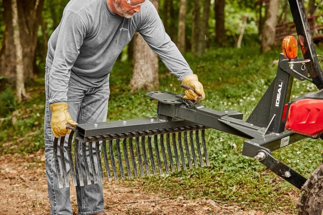 A versatile and easy to use rake, the Ideal Farm Equipment Landscape Rake makes raking, smoothing and contouring gravel or soil easy. The curved C-Tines are shallow enough to protect your field, but can be angled to move items such as rocks easily. Order an optional wheel kit (LRWKID) to set your depth and improve maneuverability.