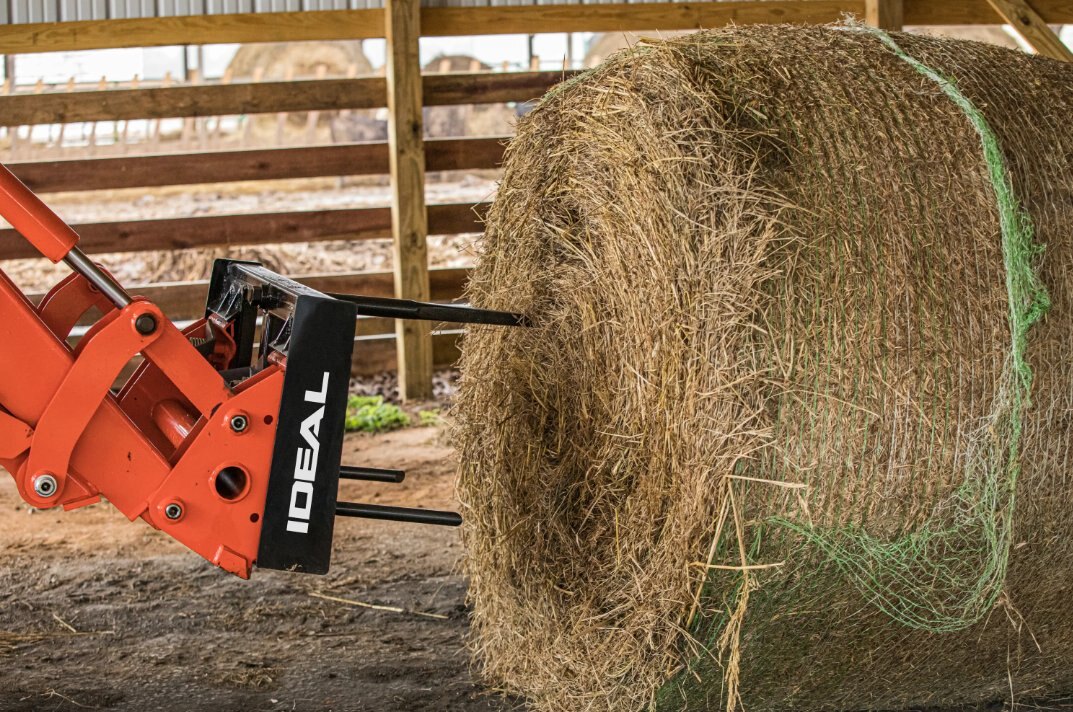 You can literally lift a ton with Ideal Equipment's Single Spear Bucket Hay Fork. This implement easily mounts and dismounts using a simple single bolt. Hay bales up to 2,000 pounds are no match for its stability and hold. Two rugged stabilizer bars keep the bale in place as you maneuver. There's no need to worry about rust or corrosion with Ideal's powder coat finish.