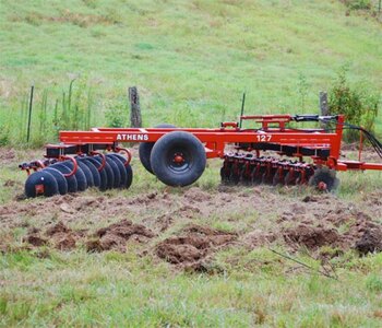 The Athens Offset Disk Harrows have the features, sizes, and weights to handle nearly any disking job on the farm. They can easily plow through stalks and stubble, prepare seedbeds, or incorporate chemicals. The Model 127 and 167 make operation a breeze with standard equipment like hydraulic leveling. These offsets are durable and dependable, making Athens the best choice for finishing or primary tillage. The 127 Offset Disk is available in 6' 6" to 12' 6" cutting widths with 9 1/2" spacing and 24" x 1/2" cut-out or smooth discs.