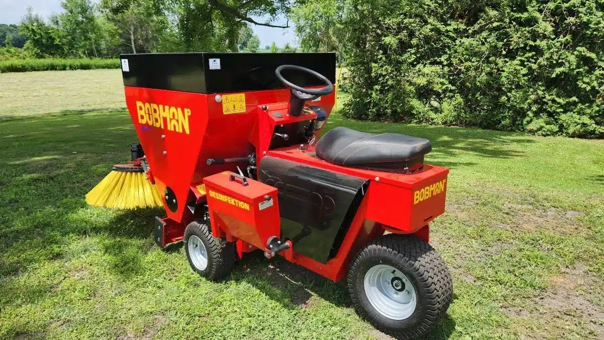 hopper extension gives 700 L capacity, extra mix shaft to prevent bridging, separate 10 L disinfectant/lime spreader, rotary brush, manure scraper with manual lift.