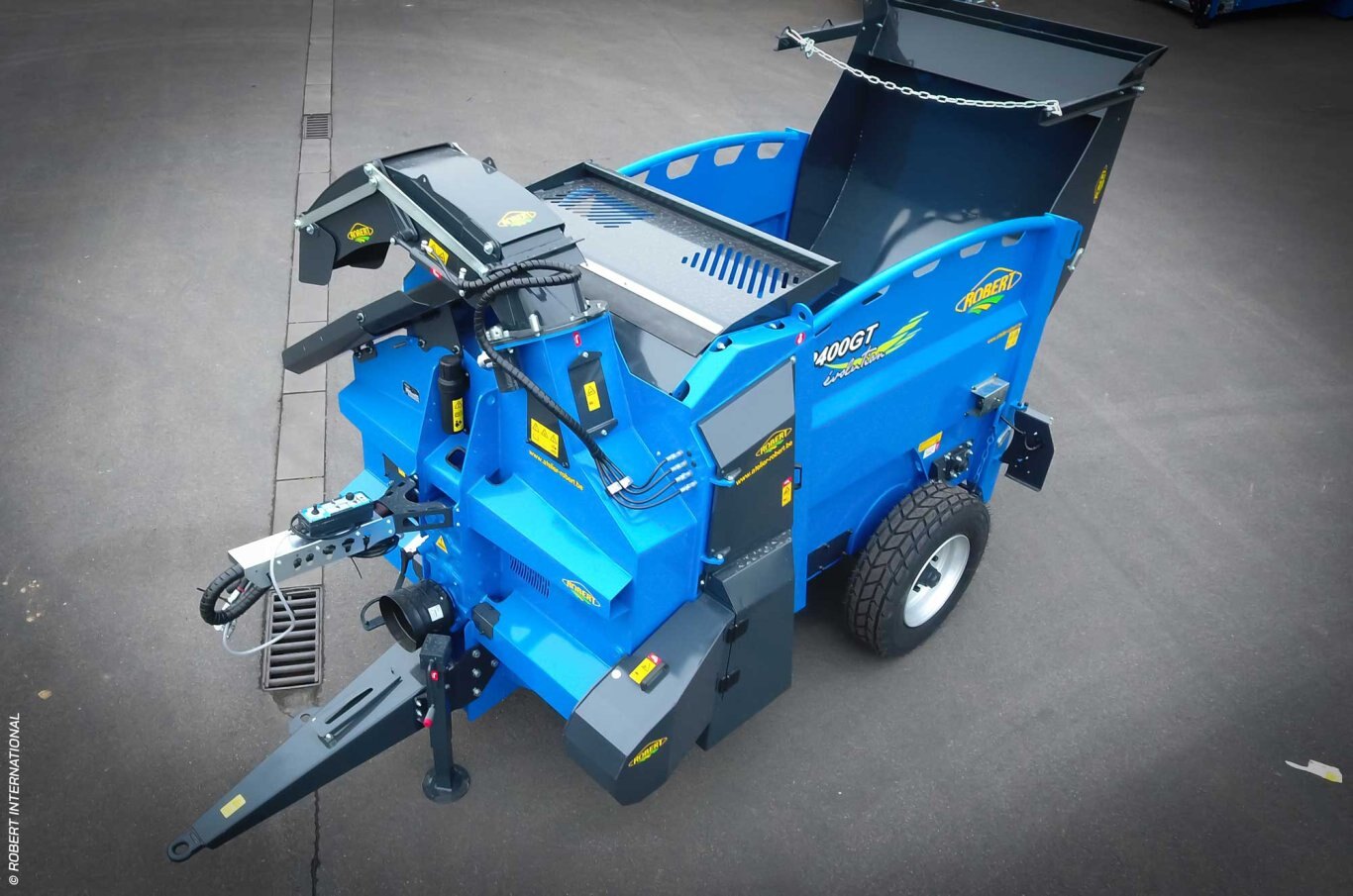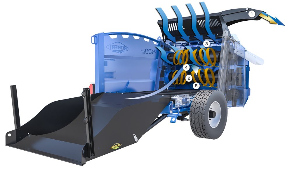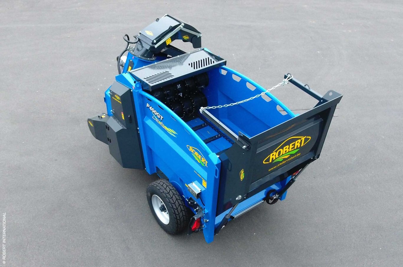 With its double-base conveyor and anti-projection casing arranged above the separator, the P400 permits clean working, without the necessity for a clean-up operation after the completion of a pass.